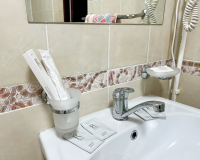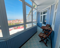 Санузел оборудован душевой кабиной, унитазом, биде, раковиной с зеркалом и феном. Уютная лоджия с панорамными окнами и летней мебелью, прекрасным видом на город и море.
